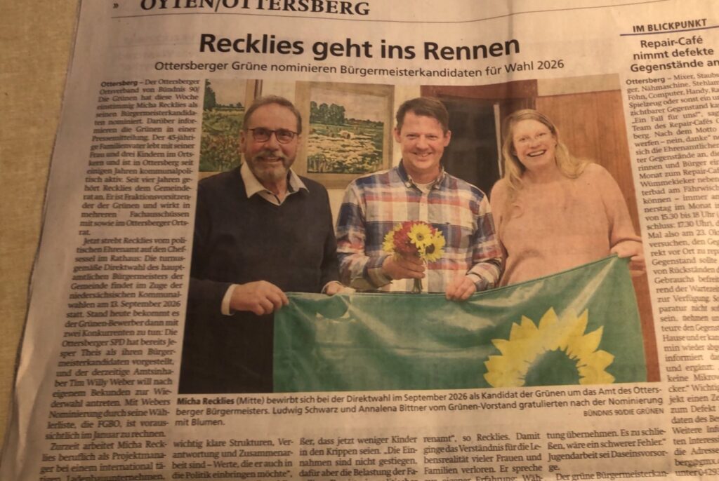 Die regionale Presse hat die Nominierung von Micha Recklies als Bürgermeisterkandidat für Ottersberg mit großem Interesse aufgenommen. Am 17. Oktober erschien in mehreren Zeitungen ein ausführlicher Artikel über seine Kandidatur und politischen Schwerpunkte – ein starkes Signal für Michaels Start in den Wahlkampf.